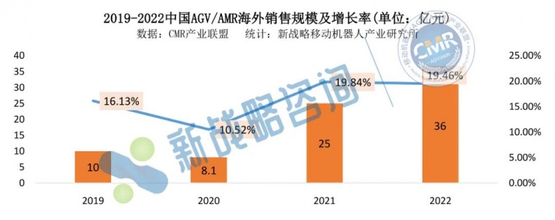 2019-2022中國AGV/AMR海外銷售規(guī)模及增長率