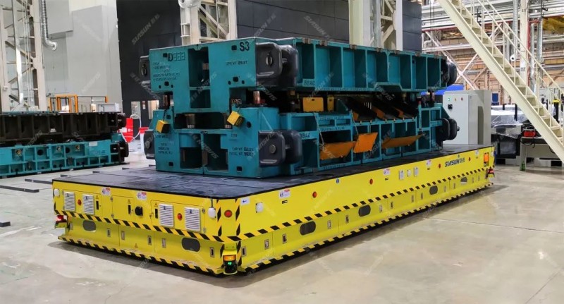 亮點:此項目中,為了適應生產工藝,AGV被設計成兩身段結構,由主動力部分帶動一個附屬托架的形式。分段式結構可有效解決長車身結構在轉彎時的問題,實現小轉彎半徑運行,更加靈活,節省運行時的占地面積。同時,為了適應發動機的構造,全新設計了托架部分,即使在急停等特殊情況下,AGV承載的發動機也不會跌落。