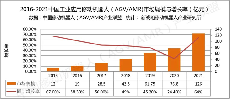2021年,是移動機器人高速發展的一年,在產業智能化升級是發展大勢下,移動機器人引來了新一輪的爆發,“增長”成為行業的主旋律,大部分企業業績都得到了翻倍或更多的增長率,市場需求持續向好,工業應用移動機器人整體市場規模相較于上一年增長幅度也有了很大提升。
